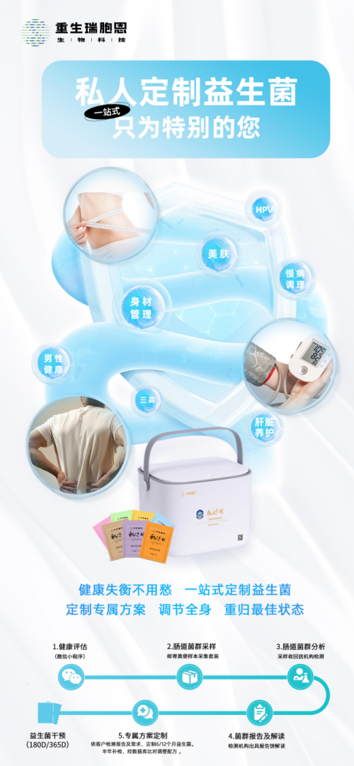 随着微生物组产业迈入高速发展的黄金期,未来竞争不再是单一产品的角逐,而是整体解决方案与数据驱动精准干预能力的较量。从微生态检测起步,到基于专利菌株的精准配比,再到持续的效果追踪与方案优化,重生瑞胞恩构建了从检测、解读到干预的完整生态。每一环节均围绕个体微生态特征展开,形成了持续优化的健康管理闭环,是真正意义上的“活”的解决方案。